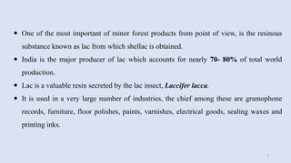 Lac is a resin secreted by lac insects that feeds on certain tree species in India. India produces 70-80% of the world's lac. Lac insects of two varieties (Kusmi and Rangeeni) feed on different host trees and have distinct breeding cycles. Lac is collected and processed into products like stick lac, seed lac, shellac. Shellac is a purified form of lac used in industries like phonograph records, furniture, and electrical goods due to its hardness, adhesion and electrical resistance properties.