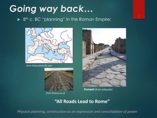 This document discusses the history of urban planning from ancient Rome to modern times, covering topics like the industrial revolution, urbanization, suburbanization, and new urbanism. It examines the factors that drove urban growth and changes in settlement patterns over time, as well as the social, economic, and environmental impacts of planning decisions. The rise and decline of cities in relation to transportation innovations and policies is a major theme throughout.
