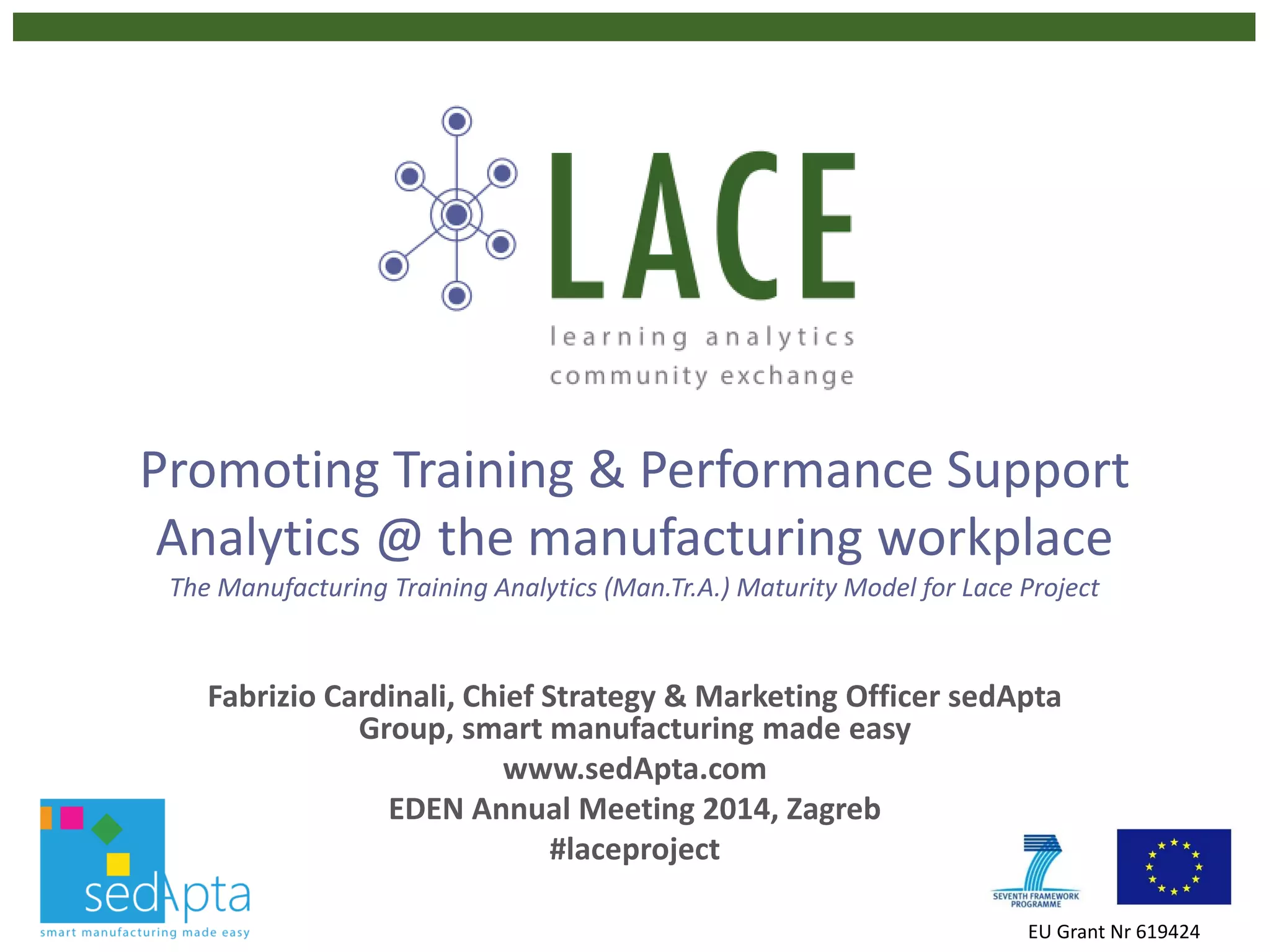 The document discusses the need for transformation in the manufacturing industry towards a demand-driven value network, emphasizing the integration of processes and data across supply chains. It presents the Manufacturing Training Analytics (man.tr.a.) maturity model as a tool for assessing and improving training and performance support within workplaces. The focus is on enhancing learning retention and operational efficiency through continuous, context-based support rather than traditional training methods.