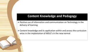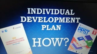 This document provides guidance for teachers on continuous professional development. It discusses reflecting on teaching practice and planning goals for improvement in using new learning delivery modalities. The document includes a self-assessment questionnaire, templates for setting goals and an individual development plan. It emphasizes aligning professional development with the Philippine Professional Standards for Teachers across domains like content knowledge, learning environment, diversity of learners and more. Teachers are guided to identify priorities, choose relevant training programs and discuss topics at their School Learning Action Cell meetings to strengthen practice.