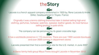 Lacoste is a French apparel company established in 1933 that originally focused on tennis clothing but expanded into other categories like perfume, footwear, watches, and leather goods. It is known worldwide for its green crocodile logo and polo shirts. Lacoste has a presence in 115 countries through boutiques and department store corners. It was acquired by a Swiss family group in 2012 and launched its U.S. e-commerce site in 2007. The document discusses Lacoste's brand portfolio across categories like men's, women's, and kids' clothing and accessories. It also analyzes the brand's pyramid in terms of imagery, feelings, judgments, and resonance associated with the brand. Potential brand extensions into sports clubs and
