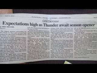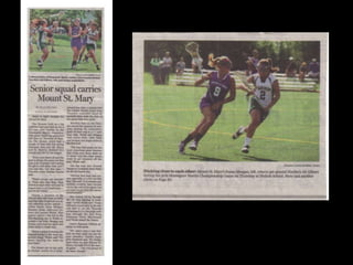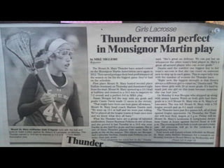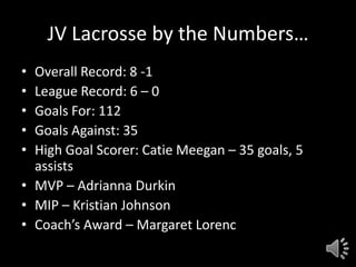The JV lacrosse team had an outstanding season, going 8-1 overall and 6-0 in league play, scoring 112 goals while only allowing 35. Catie Meegan led the team in scoring with 35 goals and 5 assists. The team won the Monsignor Martin League championship undefeated. The varsity team also had a successful season, going 15-2 overall and 14-0 in league play, scoring 234 goals while only allowing 102. Susie Meegan scored 50 goals to lead the team and was named MVP. Both teams celebrated their success at an alumni game bringing together past and present players.