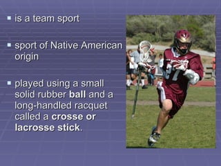 Lacrosse is a team sport of Native American origin that involves using a crosse to play with a small rubber ball, and it has evolved from 12th-century ceremonial games to modern organized competitions in Canada and the United States. The game is played by ten players per team, with specific positions and rules regarding gameplay, and includes championships for various age and gender levels, particularly dominated by the U.S. and Canada. The 2010 FIL World Lacrosse Championships will feature 30 nations and take place at Manchester University Sports Grounds.