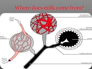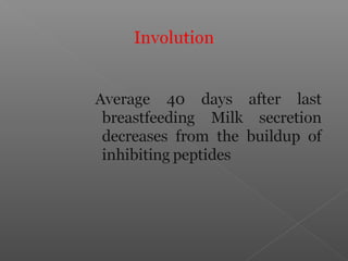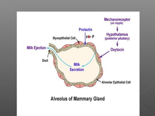 This document discusses the anatomy and physiology of breastfeeding. It explains that during pregnancy, the breasts undergo growth and maturation in preparation for milk production. The hormones prolactin and oxytocin play key roles - prolactin stimulates milk production while oxytocin triggers the let-down reflex and ejection of milk from the breasts upon suckling. The suckling stimulus triggers neural pathways that signal the hypothalamus and pituitary gland to release oxytocin. Regular milk removal is necessary to maintain lactation through autocrine control systems.