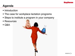 This document discusses the benefits of establishing lactation programs in the workplace. It notes that lactation programs provide important health benefits for both employees and employers. For employees, lactation programs support healthier babies and mothers as well as work-life balance. For employers, lactation programs improve compliance with laws, reduce healthcare costs, increase employee satisfaction and retention, and provide a recruiting advantage. The document provides steps for starting a lactation program, including establishing a team, gathering data, obtaining approval, implementation, communication, and assessment. Resources for additional information on lactation programs are also included.