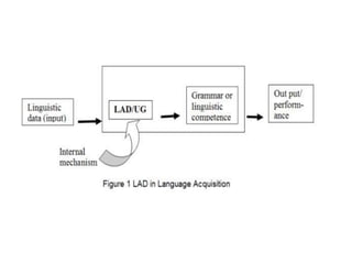 Language develops through a process of innate abilities interacting with environmental influences. Children are born with an innate language acquisition device that gives them the ability to learn the structure of any human language. According to Chomsky, this includes a universal grammar consisting of principles common to all languages. Vygotsky also viewed language development as a social process, where children acquire language abilities through interaction with others. Stages of language acquisition begin with pre-linguistic sounds and progress to single words, word combinations, and eventually grammatically complex speech over the first 5-6 years of life.