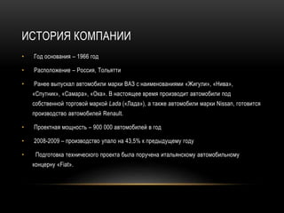 Автоваз, основанный в 1966 году в Тольятти, Россия, является производителем автомобилей под брендом Lada и прекратил выпуск моделей ВАЗ, известных на Западе, как 'жигули'. В 2008-2009 годах компания столкнулась с падением производства на 43,5%, тем не менее сохраняет значительную долю на российском рынке и планирует выпустить 6 новых моделей к 2017 году. Основные задачи компании включают увеличение экспорта на 50% и поддержание положительного денежного потока.