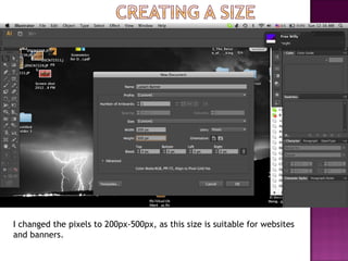 The author changed the pixel size of an image to 200-500px to make it suitable for websites and banners. They added a rectangle shape and gradient colors, then a thicker dark purple border. Text was added in Myriad Web Pro font and gold yellow color. An image was inserted and its edges feathered by 9 pixels to blend it in.