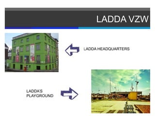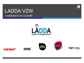 The document announces 14 events happening with LADDA VZW in April and May 2012, including a congress on youth culture, exhibits at the Red Bull Space in Antwerp, live music performances by various artists, and the 500th episode of Duyster radio show taking place live from Dok.