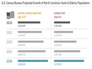 - Several states are projected to see large increases in their elderly populations from 2010-2030 according to Census data, while some states may see declines in youth populations.