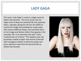 Lady Gaga uses her stage name to separate her personal and public lives and control her image. She intentionally created an outrageous persona to divert attention from her private self. The music video for "Paparazzi" imitates styles from old Hollywood films and Hitchcock's Vertigo to homage other artists, tell the story through camera angles and imagery, and portray Lady Gaga at a larger-than-life scale.
