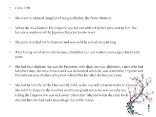 Lady Nijo, adopted by her grandfather, became a courtesan to the Japanese emperor at fourteen but later fell out of favor, turning to Buddhism and spending twenty years traveling Japan. She had four children, including one with the emperor, and faced challenges in concealing her pregnancies. The document draws parallels between Lady Nijo's life and the character Hero in 'Much Ado About Nothing', showcasing her journey from obedience to independence.