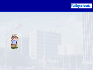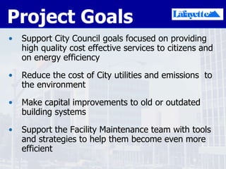 Frank Phillips presented on making municipal facilities in the City of Lafayette more energy efficient through performance contracting. The goals were to reduce utility costs and emissions while supporting capital improvements and the Facility Maintenance team. Performance contracting allows selecting a firm to study and implement efficiency projects, with operational savings used to pay for improvements. A $1.27 million project identified 39 efficiency projects across infrastructure that will save $116,414 annually over 10 years through a variety of upgrades like lighting, HVAC, insulation, and traffic lights.