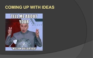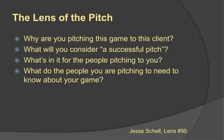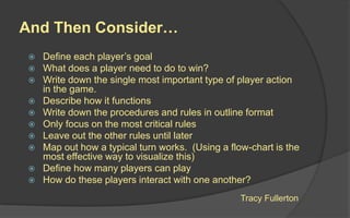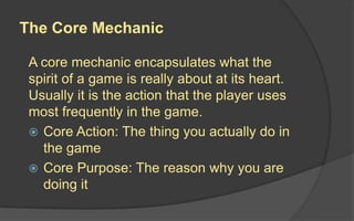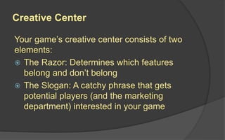 The document provides an overview of the game design process, outlining key stages from brainstorming game ideas to prototyping and playtesting core mechanics to balancing dynamic elements, with a focus on iterative design and playtesting to involve players throughout development. It also discusses techniques for brainstorming such as coming up with game concepts and mechanics, refining ideas, and testing concepts with potential players to help narrow down the best ideas.
