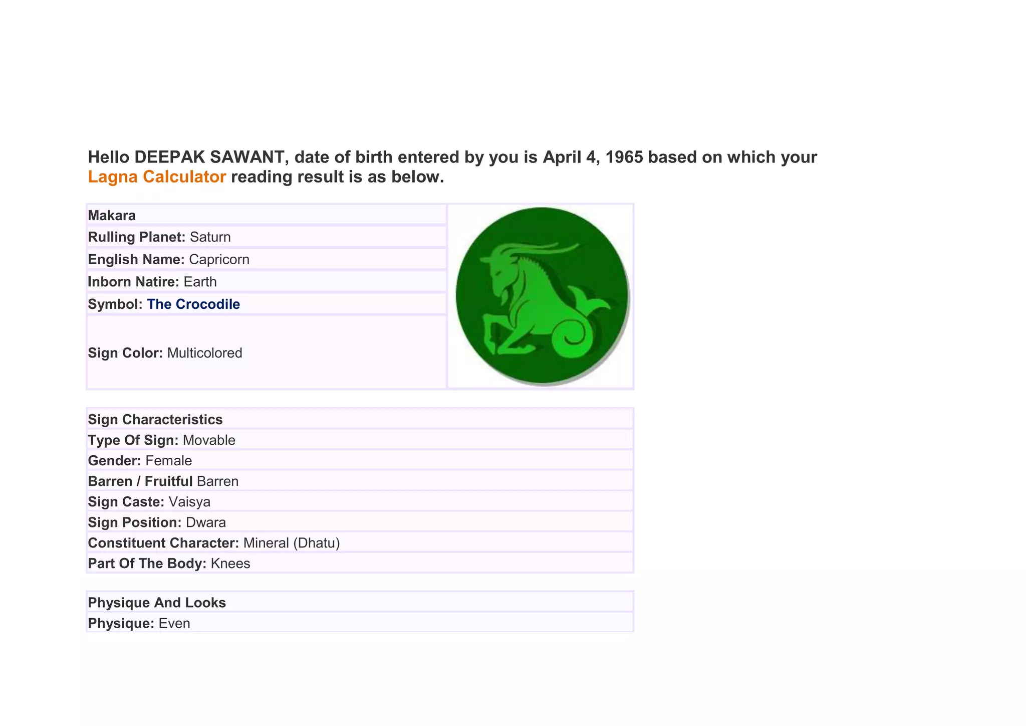 Based on the provided date of birth, the document summarizes the astrological sign of Makara or Capricorn. It describes Makara's ruling planet Saturn, inborn nature of earth, symbol of the crocodile, and characteristics like being a movable, female, barren sign. It also summarizes predictions for the individual's physique, nature, career involving finances, love and compatibility, health concerns like blood problems and knees, and lucky factors like days, numbers, and gemstones.