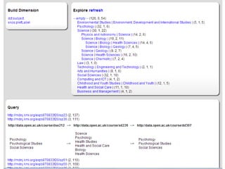 The document discusses the integration of linked data in learning analytics to enhance the interpretation of data mining results, emphasizing the necessity of background knowledge for effective analysis. It proposes an approach that builds a navigation structure from sequential patterns of student course enrollments, leveraging linked data to provide context and meaning. The conclusion highlights the value of using linked data to refine analytics and supports the iterative process of data interpretation in educational contexts.