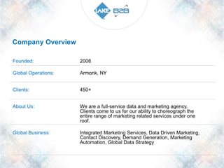 Founded in 2008, Lake B2B is a full-service data and marketing agency based in Armonk, NY, serving over 450 clients with integrated and data-driven marketing services. The company specializes in demand generation, marketing automation, and a comprehensive 360° marketing platform designed to enhance business growth. Their solution offerings include web development, brand management, social media marketing, and contact discovery, aimed at delivering quantifiable results and nurturing leads into successful deals.