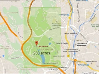 The document discusses Lake Gardens, a 230-acre botanical garden in Kuala Lumpur, Malaysia. It was proposed in 1888 by Alfred Venning to turn a swampy valley into a botanical garden. It now features various gardens and attractions, including a National Monument, Deer Park, Hibiscus Garden, Butterfly Park, Bird Park, and Orchid Garden. The gardens host recreational activities, musical performances, and exhibitions.