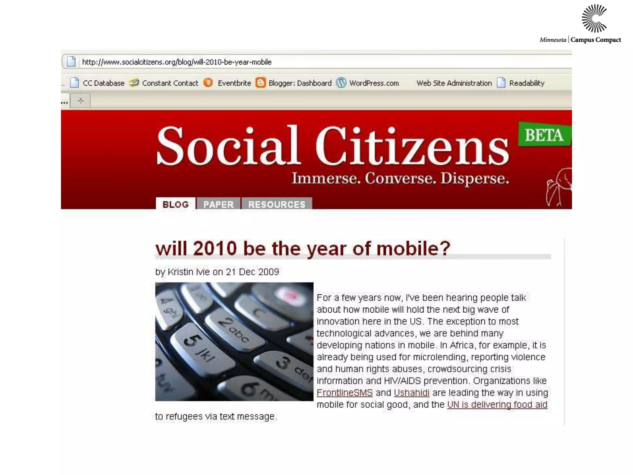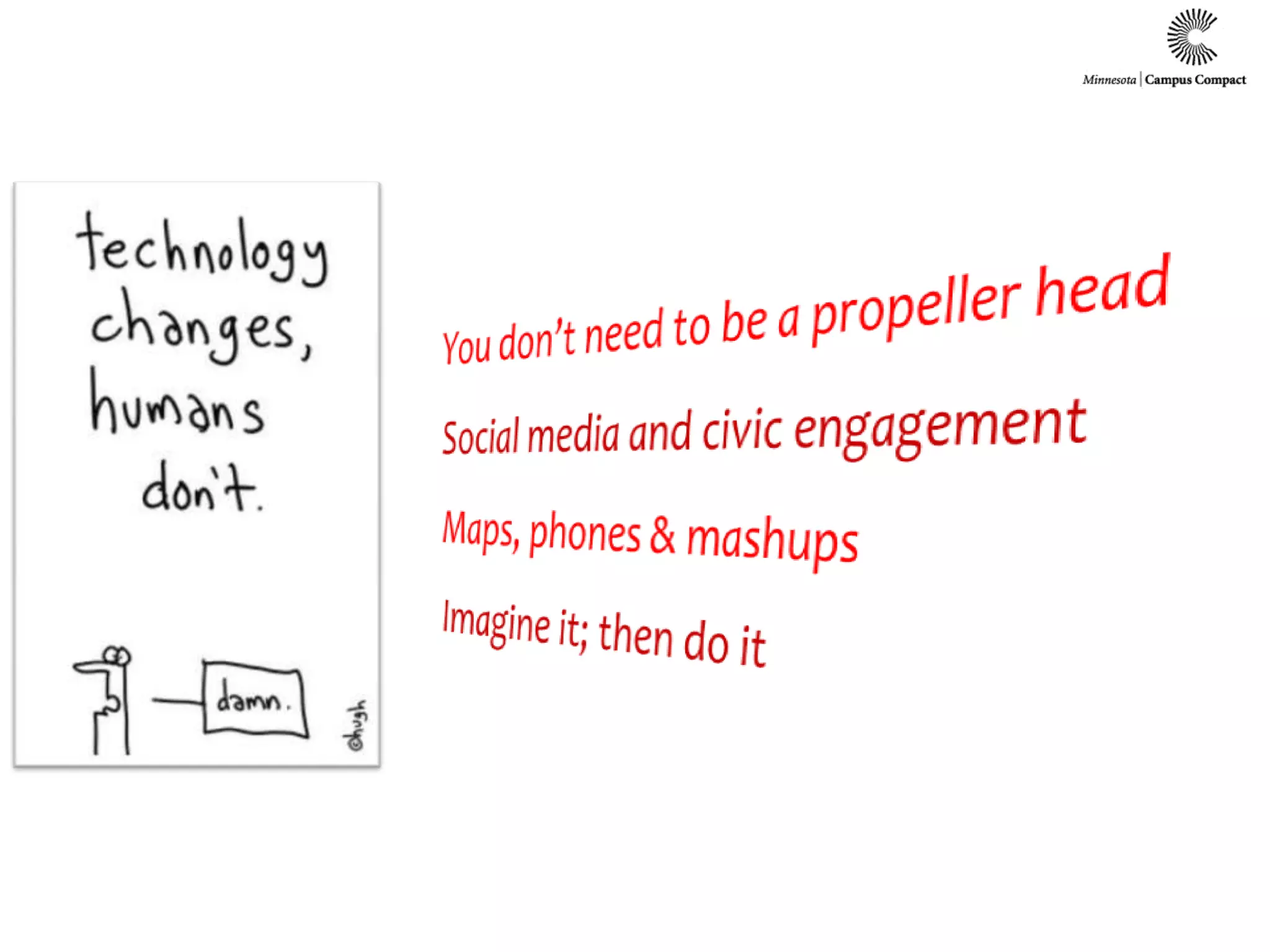 This document discusses how innovative technology use can engage students and communities. It provides examples of how social media is changing civic engagement and how mobile phones and mapping applications ("mashups") are empowering people. The document encourages imagining new uses of technology and provides ideas like live webinars, idea sharing, and crowdsourcing. It advocates exploring emerging technologies to support civic engagement in higher education.