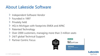 This document provides an overview of Lakeside Software, an independent software vendor founded in 1997 that is privately held and headquartered in Michigan. It has over 2000 customers managing more than 3 million seats. Lakeside Software focuses on partner relationships and has developed patented technology and a SysTrack MarketPlace to provide performance and health monitoring solutions. SysTrack can monitor desktops, laptops, servers and more to improve the user experience, troubleshoot issues, and aid in planning IT environments. It collects data through lightweight agents and stores samples to provide insights to solve problems.
