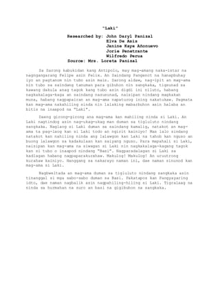 Isang kwento tungkol sa mag-amang Felipe at Felix na nagtatanim ng tubo at mais sa Antipolo. Isang araw, habang nagluluto sila ng sangkaka, nakakita sila ng isang malaking lalaking tinatawag na 'laki' na pumasok sa kanilang kamalig, na nagdulot ng takot sa kanila. Upang mapaalis si laki, nagbigay sila ng basi, at pagkatapos ng insidente, nagpatuloy ang kanilang gawain sa pagtatanim.
