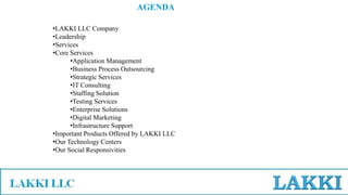 Lakki LLC is a rapidly growing IT consulting company offering a wide range of services including application management, business process outsourcing, strategic consulting, and digital marketing. The company focuses on providing innovative solutions tailored to client needs, leveraging disruptive technologies to enhance business performance. Additionally, Lakki emphasizes corporate social responsibility by supporting veterans in IT through training and job placement initiatives.