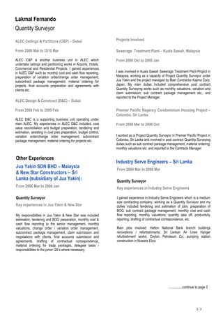 Lakmal Fernando is a Quantity Surveyor with 18 years of experience in construction projects in Dubai, UAE, Malaysia, and Sri Lanka. He has worked as a Quantity Surveyor for 12 years on projects such as hotels, airports, and commercial developments. For 6 years, he also served as a Site Engineer and Assistant Quantity Surveyor. Lakmal holds an MSc in Project Management and MBA. He is looking for a new challenging role that utilizes his experience in cost estimation, contract management, variation orders, and final accounts.