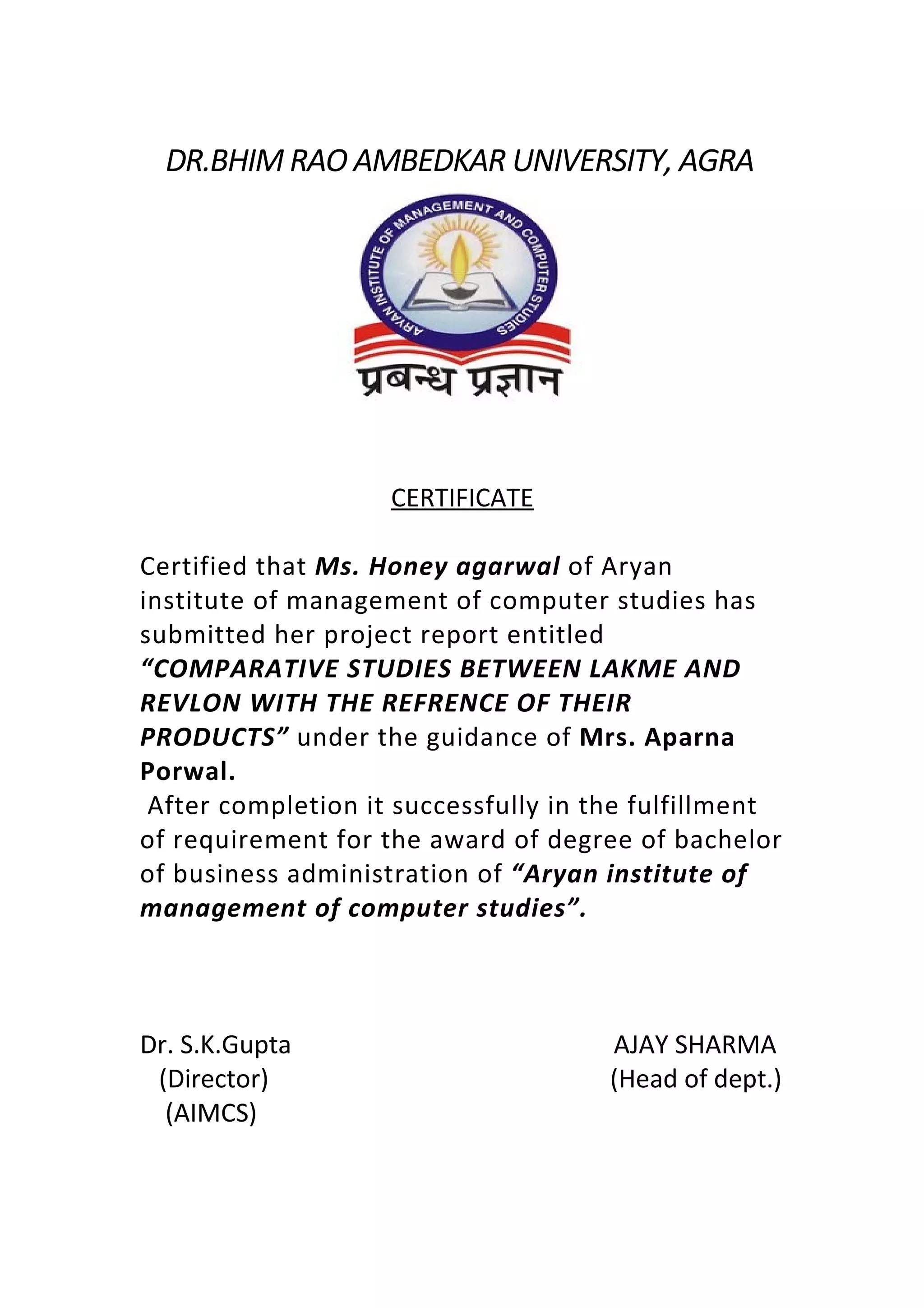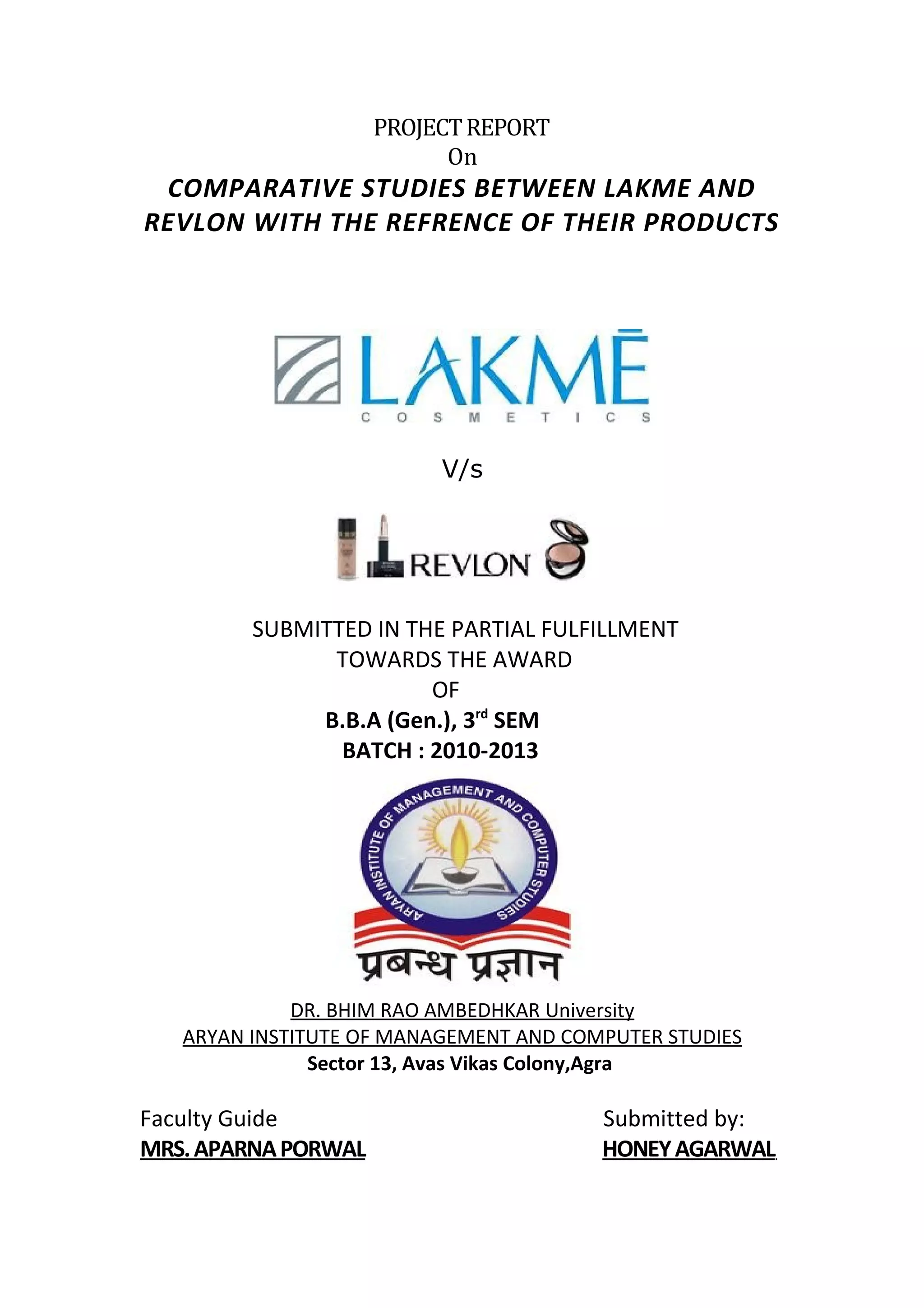 This document provides an overview of a project report that compares marketing strategies and products between Lakme and Revlon in India. It includes an introduction on the cosmetics industry in India and market trends. It also provides company profiles of Lakme and Revlon. The document outlines the objectives of the study and research methodology. It includes sections on data analysis, recommendations, and conclusions. The report was submitted by Honey Agarwal to fulfill requirements for a Bachelor's degree in business administration.