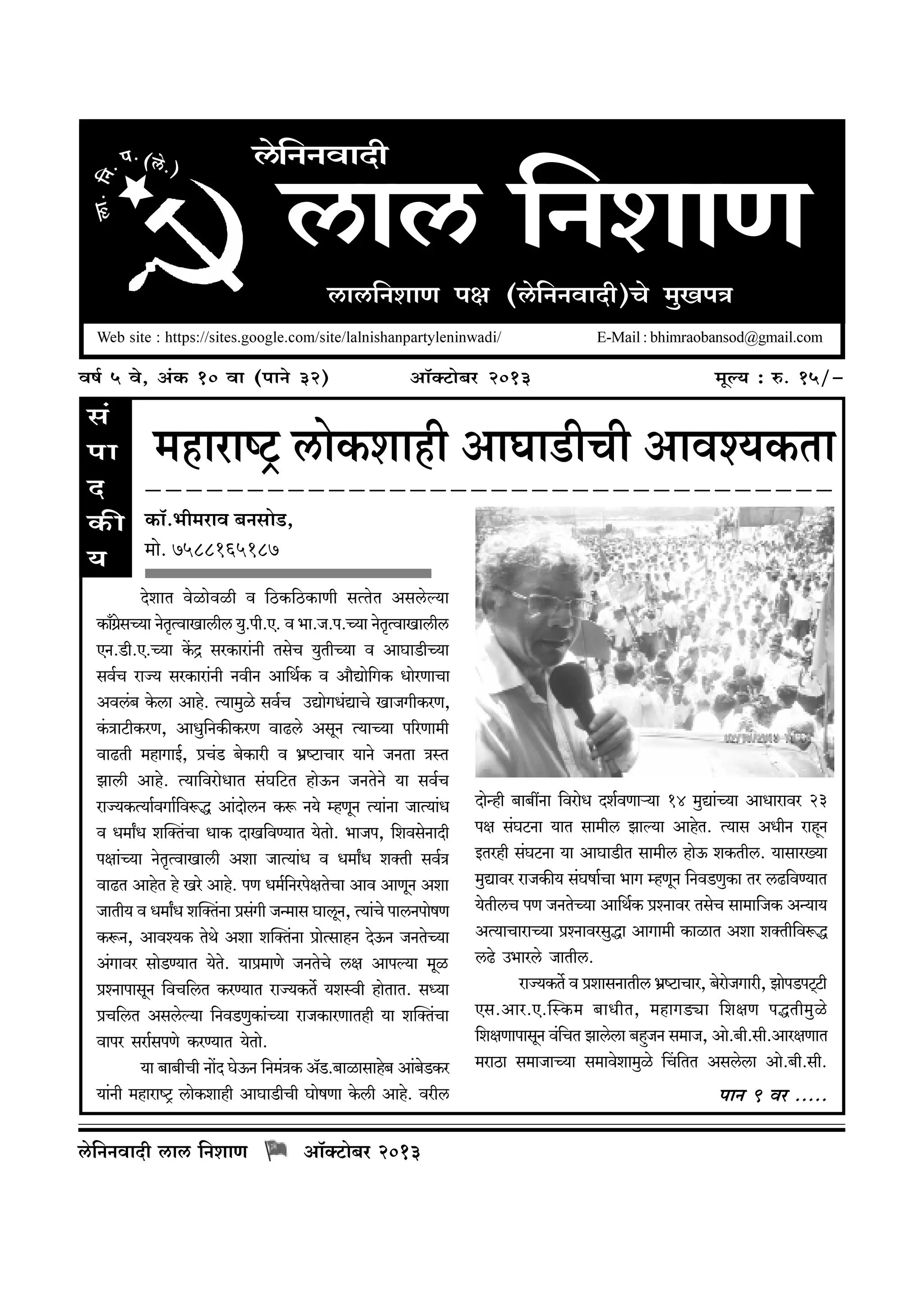 {ZemU cmc{ZemU nj (co{ZZdmXr)Mo ‘wInÌ Web site : https://sites.google.com/site/lalnishanpartyleninwadi/ df© 5 do, A§H$ 10 dm (nmZo 32) g§ nm X H$s ` Am°³Q>mo~a 2013 E-Mail : bhimraobansod@gmail.com ‘yë¶ : é. 15/- _hmamîQ´> cmoH$emhr AmKmS>rMr Amdí`H$Vm H$m°.^r_amd ~ZgmoS>, _mo. 7588165187 XoemV doimodir d {R>H${R>H$mUr gËVoV Agcoë`m H$m±JgÀ`m ZoVËdmImcrc `w.nr.E. d ^m.O.n.À`m ZoVËdmImcrc o« ¥ ¥ EZ.S>r.E.À`m H|$Ð gaH$mam§Zr VgoM `wVrÀ`m d AmKmS>rÀ`m gd©M amÁ` gaH$mam§Zr ZdrZ Am{W©H$ d Am¡Úmo{JH$ YmoaUmMm Adc§~ Ho$cm Amho. Ë`m_wio gd©M CÚmoJY§ÚmMo ImOJrH$aU, H§$ÌmQ>rH$aU, AmYw{ZH$sH$aU dmT>co AgyZ Ë`mÀ`m n[aUm_r dmT>Vr _hmJmB©, àM§S> ~oH$mar d ^«îQ>mMma `mZo OZVm ÌñV Pmcr Amho. Ë`m{damoYmV g§K{Q>V hmoD$Z OZVoZo `m gd©M amÁ`H$Ë`m©dJm©{dê$Õ Am§XmocZ H$ê$ Z`o åhUyZ Ë`m§Zm OmË`m§Y d Y_mªY epŠV§Mm YmH$ XmI{dÊ`mV `oVmo. ^mOn, {edgoZmXr njm§À`m ZoVËdmImcr Aem OmË`m§Y d Y_mªY eŠVr gd©Ì ¥ dmT>V AmhoV ho Iao Amho. nU Y_©{ZanojVoMm Amd AmUyZ Aem OmVr` d Y_mªY epŠV§Zm àg§Jr OÝ_mg KmcyZ, Ë`m§Mo nmcZnmofU H$ê$Z, Amdí`H$ VoWo Aem epŠV§Zm àmoËgmhZ XoD$Z OZVoÀ`m A§Jmda gmoS>Ê`mV `oV. `mà_mUo OZVoMo cj Amnë`m _yi o àíZmnmgyZ {dM{cV H$aÊ`mV amÁ`H$V} `eñdr hmoVmV. gÜ`m àM{cV Agcoë`m {ZdS>UH$m§À`m amOH$maUmVhr `m epŠV§Mm w dmna gam©gnUo H$aÊ`mV `oVmo. `m ~m~rMr Zm|X KoD$Z {Z_§ÌH$ A°S>.~mimgmho~ Am§~S>H$a o `m§Zr _hmamîQ´> cmoH$emhr AmKmS>rMr KmofUm Ho$cr Amho. darc co{ZZdmXr cmc {ZemU Am°³Q>m~a 2013 o XmoÝhr ~m~tZm {damoY Xe©dUmè`m 14 _wÚm§À`m AmYmamda 23 nj g§KQ>Zm `mV gm_rc Pmë`m AmhoV. Ë`mg AYrZ amhÿZ BVahr g§KQ>Zm `m AmKmS>rV gm_rc hmoD$ eH$Vrc. `mgma»`m _wÚmda amOH$s` g§Kfm©Mm ^mJ åhUyZ {ZdS>UH$m Va cT>{dÊ`mV w `oVrcM nU OZVoÀ`m Am{W©H$ àíZmda VgoM gm_m{OH$ AÝ`m` AË`mMmamÀ`m àíZmdagwÕm AmJm_r H$mimV Aem eŠVr{dê$Õ cT>o C^maco OmVrc. amÁ`H$V} d àemgZmVrc ^«îQ>mMma, ~oamoOJmar, PmonS>nQ²>Q>r Eg.Ama.E.pñH$_ ~mYrV, _hmJS>çm {ejU nÕVr_wio {ejUmnmgyZ d§{MV Pmcocm ~hþOZ g_mO, Amo.~r.gr.AmajUmV _amR>m g_mOmÀ`m g_mdoem_wio qM{VV Agcocm Amo.~r.gr. nmZ 9 da ..... 1
