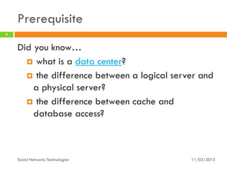 The document provides an overview of social network technologies, highlighting their evolution from traditional websites to complex platforms that require robust infrastructure. It discusses tools, languages, and architectures utilized by major social networks like Facebook and Pinterest to manage scalability and handle massive user engagement. Additionally, it emphasizes the importance of effective data management and continuous adaptation to growth and user demands.
