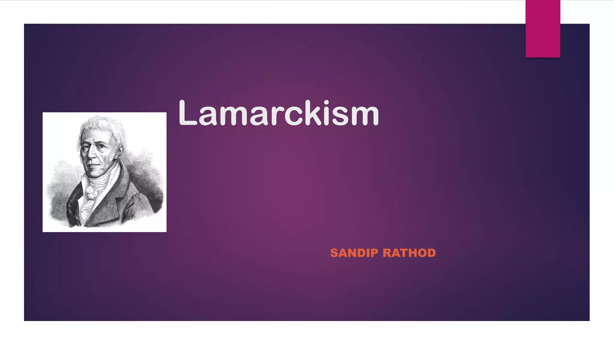 1) Lamarckism is a theory of organic evolution that proposes that complex organisms evolved from simpler organisms, and that characteristics acquired over the lifetime of organisms can be inherited by offspring.