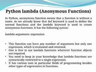 The document explains Python lambda functions, which are anonymous functions defined using the 'lambda' keyword. It highlights their syntax, uses in programming, and provides examples including their application with 'filter()' and 'map()' functions. Additionally, it shows how to create custom functions that utilize lambda functions for tasks like doubling or tripling numbers.