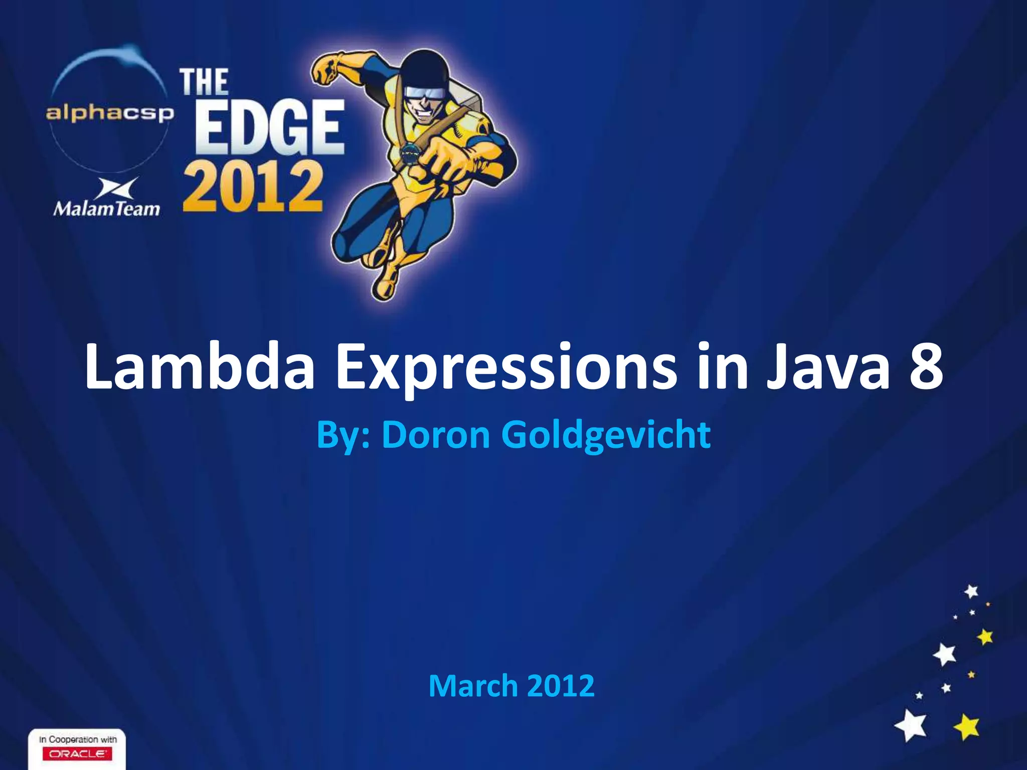This document discusses lambda expressions in Java 8. It provides an overview of lambda syntax, how lambda expressions implement functional interfaces, comparisons to anonymous inner classes, target typing, examples of using lambda expressions to filter, map and reduce collections, and conclusions about improved readability and performance with lambda expressions.