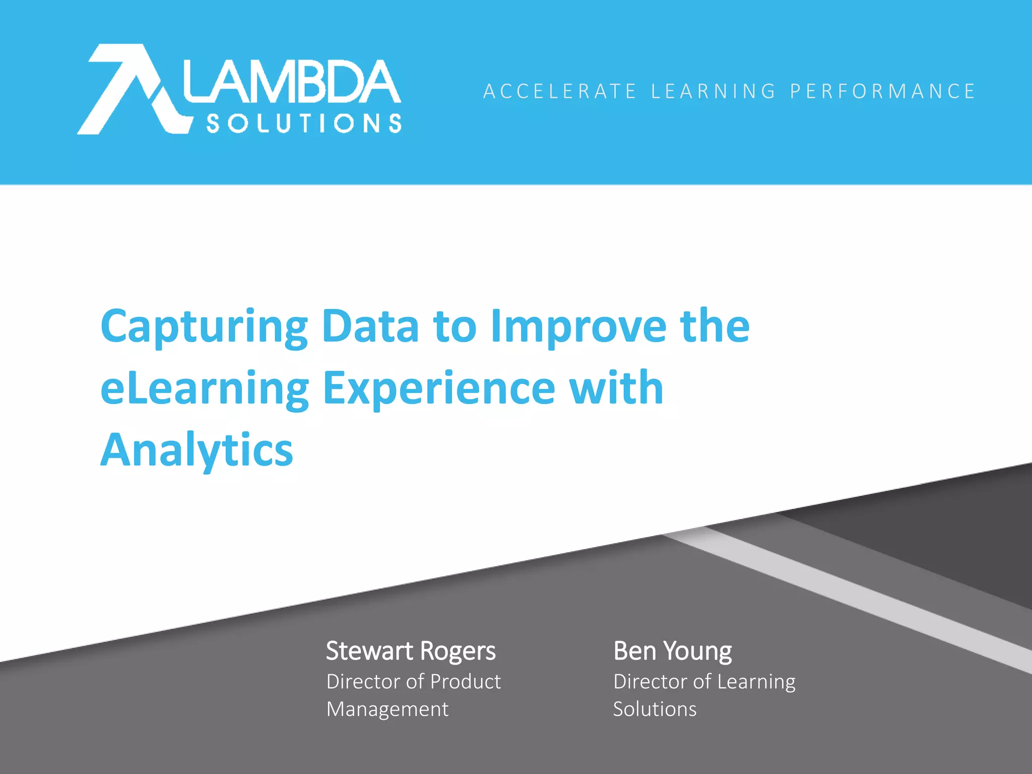 The document discusses the importance of learning analytics in enhancing e-learning experiences by capturing and analyzing data related to learner engagement and performance. It outlines common challenges organizations face in accessing and utilizing LMS data, while suggesting techniques to implement learning analytics effectively, such as using KPIs and having a data strategy. Additionally, it introduces Zoola Analytics as a solution to streamline reporting and improve learning outcomes.