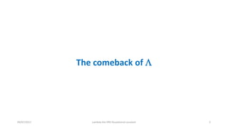 Lambda, the cosmological constant, is considered the fifth foundational constant in physics along with the speed of light c, Planck's constant h, gravitational constant G, and Boltzmann's constant k. Einstein, de Sitter, Lemaitre, and others originally considered Lambda in their early formulations of cosmology. Lambda represents the energy density of empty space and is related to the curvature of spacetime. Its observed value plays a key role in the current Lambda-CDM model of cosmology, which describes our flat, expanding universe containing dark matter, dark energy, and other components.