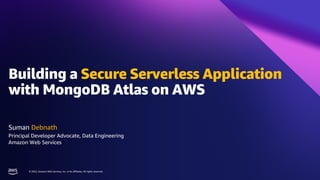 The document discusses building a secure serverless application with MongoDB Atlas on AWS. It will show how to create an application with Amazon API Gateway, AWS Lambda, MongoDB Database with peering connection, and deploy it using Serverless Application Model (SAM) in under 30 minutes. The presenter is Suman Debnath from Amazon Web Services, discussing data engineering.
