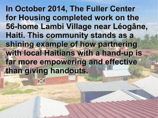 Despite being a small, grass-roots nonprofit, The Fuller Center for Housing has built more than 150 safe and decent permanent homes in Haiti since the 2010 earthquake — including 56 in Lambi Village. Lambi stands as a shining example of how Haitian families can be helped and empowered with a hand-up approach, as opposed to the kind of well-meaning handouts that nevertheless have created and exacerbated a culture of dependency in Haiti. If just a tiny percentage of the billions that flowed in to help Haiti in the aftermath of the quake had gone to the grass-roots Fuller Center, all 200,000 homes damaged by the earthquake could have been rebuilt.
