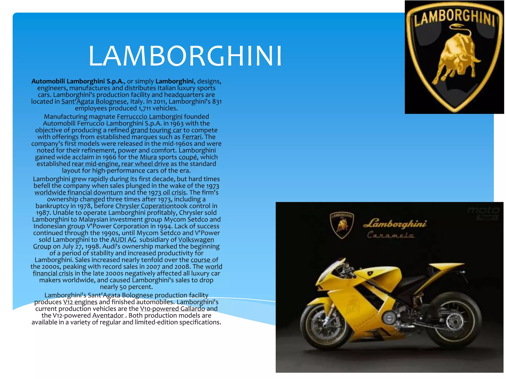 Lamborghini designs, engineers, manufactures and distributes Italian luxury sports cars from its production facility in Sant'Agata Bolognese, Italy. In 2011, Lamborghini produced 1,711 vehicles. Lamborghini was founded in 1963 by Ferruccio Lamborghini to compete with brands like Ferrari. Notable Lamborghini models include the Miura, Murcielago, Gallardo, and current flagship Aventador, which replaced the Murcielago in 2011.