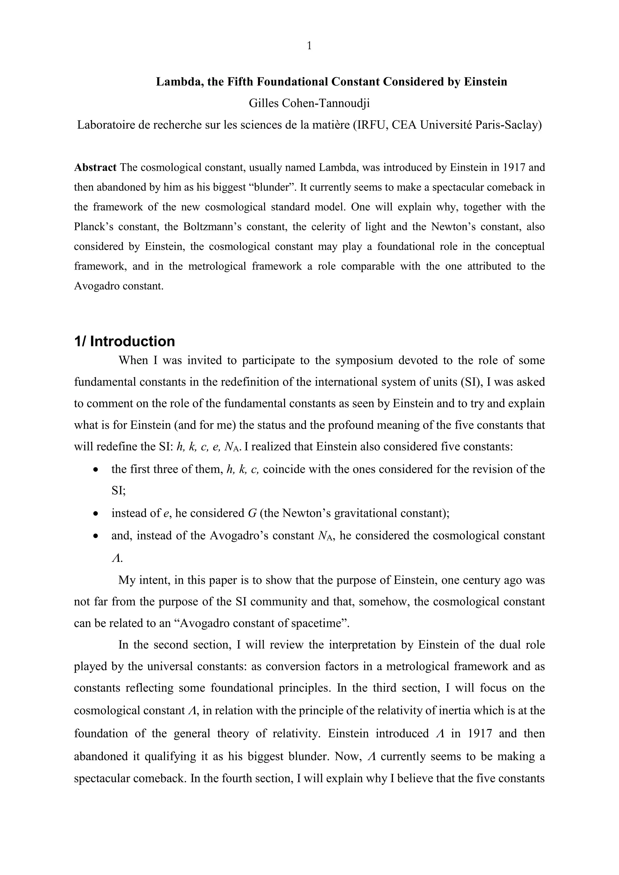 The document discusses the cosmological constant, lambda (Λ), introduced by Einstein in 1917 and later abandoned by him, which is now experiencing a resurgence in modern cosmology. It examines the role of this constant alongside other foundational constants in physics, arguing for its importance in both metrology and conceptual frameworks. The paper reflects on historical debates surrounding the cosmological constant and its implications for understanding inertia and gravitation within the scope of general relativity.