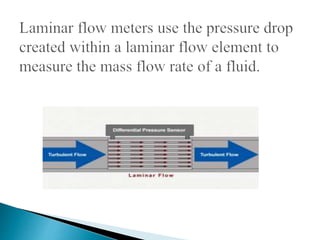 The document provides an overview of flow meters, devices essential for measuring the volume or mass of gases and liquids across various industries. It discusses different types of flow meters, their applications, advantages, and challenges, particularly with laminar flow measurement. Key concepts such as the Hagen-Poiseuille equation and flow dynamics are also highlighted, emphasizing their importance in fluid mechanics.