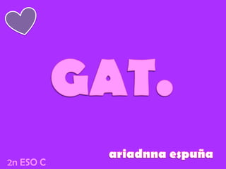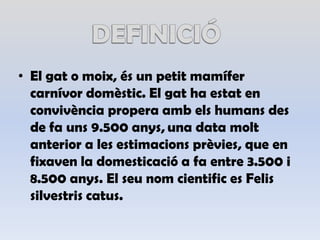 DEFINICIÓEl gat omoix,és un petitmamífercarnívordomèstic. El gat ha estat en convivènciaproperaambelshumans des de fa uns 9.500 anys,una data molt anterior a les estimacionsprèvies, que en fixaven la domesticació a fa entre 3.500 i 8.500 anys. El seunomcientific es Felissilvestriscatus.