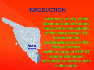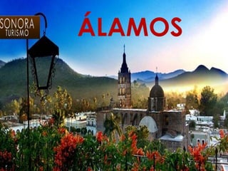 Álamos is a historic city located in southeastern Sonora, Mexico that was founded in the late 17th century after the discovery of silver mines. It has a colonial atmosphere with narrow cobbled streets and centuries-old buildings. Álamos holds several annual festivals celebrating local history and traditions, including events honoring Dr. Alfonso Ortiz Tirado and the Virgin of La Balvanera. Places of interest include the Church of the Immaculate Conception, the Viewpoint tower overlooking the city, and the Square of Arms with its majestic arches and wrought-iron balconies. The city's economy was historically based on mining and agriculture.