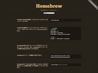 パッケージマネージャーとは? • Homebrewのデモ • npm、Bowerのデモ AGENDA