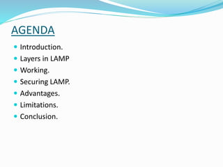 The document outlines the components and workings of the LAMP web development stack, including Linux, Apache, MySQL, and PHP. It discusses how Linux provides the base operating system, Apache is the web server, MySQL stores and retrieves data, and PHP is used to manipulate and display information. The document also covers advantages like cost-effectiveness, limitations for transient data loads, and how to secure each component of the LAMP stack.