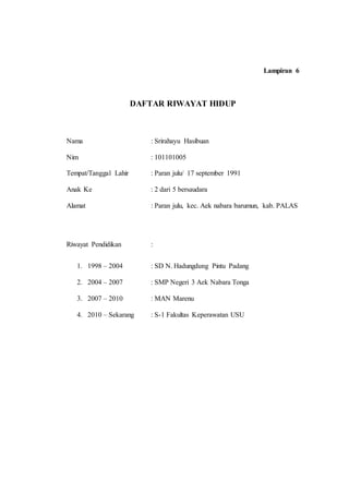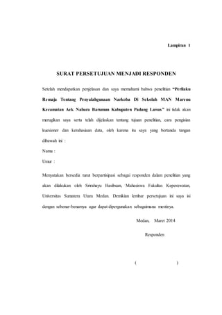 Dokumen ini berisi riwayat hidup Srirahayu Hasibuan, mahasiswa Fakultas Keperawatan Universitas Sumatera Utara, yang terlibat dalam penelitian tentang perilaku remaja terkait penyalahgunaan narkoba. Terdapat juga persetujuan dari responden untuk berpartisipasi, rincian biaya penelitian, serta jadwal kegiatan penelitian. Biaya total untuk penelitian ini adalah Rp 745.000.