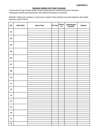 Dokumen ini adalah borang lawatan penyeliaan untuk latihan industri yang merangkumi maklumat pelatih, penilaian prestasi, dan senarai semak tugasan. Ia juga termasuk prosedur penilaian seperti portfolio latihan, laporan pematuhan, dan maklumat kehadiran bulanan pelatih. Terdapat pelbagai elemen penilaian yang perlu diisi oleh penyelia dan pelatih untuk merekodkan pengalaman latihan mereka.