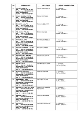 KERJA NOMOR REKENING BANK 110 WA SALIHA NIP : 196612311987032095 No. Peserta : 13200202010477 NRG : 130201611032 NUPTK : 2563744646300293 TK DW WATONEA - - - Cabang - - - No Rek. 0000 a/n - - - 111 WA SUFIA NIP : 196812312006042008 No. Peserta : 13200202010421 NRG : 130201661030 NUPTK : 0563746648300563 TK PGRI KUNCUP BUANA - - - Cabang - - - No Rek. 0000 a/n - - - 112 WA ODE TINI NIP : 197104132007012012 No. Peserta : 13200202010347 NRG : 130201683026 NUPTK : 1745749651300062 TK DHARMA WANITA WAARA - - - Cabang - - - No Rek. 0000 a/n - - - 113 WA ODE SARPATI NIP : 197803282009032007 No. Peserta : 13200202010182 NRG : 130201733040 NUPTK : 1660756657300032 TK N PEMBINA RAHA - - - Cabang - - - No Rek. 0000 a/n - - - 114 HJ.WATI SEHANI ZAIRIN NIP : 19621111984052004 No. Peserta : 13200202010559 NRG : 130201795026 NUPTK : 1443740642300043 TK KUNCUP PERTIWI KONTUNAGA - - - Cabang - - - No Rek. 0000 a/n - - - 115 HASMIN NIP : 197603072010012007 No. Peserta : 13200202010241 NRG : 130201841025 NUPTK : 6639754655300022 TK N PEMBINA RAHA - - - Cabang - - - No Rek. 0000 a/n - - - 116 WA ODE SITTI NURPATI NIP : 198005232008012012 No. Peserta : 13200202010111 NRG : 130201899030 NUPTK : 7855758661300002 TK DW KOHOLIFANO - - - Cabang - - - No Rek. 0000 a/n - - - 117 WA ODE SITTI DARWIAH NIP : 197011111999072001 No. Peserta : 13200202010371 NRG : 130201955028 NUPTK : 4443748652300003 TK DW KELURAHAN MANGGA KUNING - - - Cabang - - - No Rek. 0000 a/n - - - 118 MARMIN NIP : 19681231 2007012189 No. Peserta : 13200202010430 NRG : 130201963039 NUPTK : 8563746649200253 TK DW KELURAHAN RAHA II - - - Cabang - - - No Rek. 0000 a/n - - - 119 YUNI NIP : 196212311984032122 No. Peserta : 13200202010548 NRG : 130201994034 NUPTK : 6563740642300363 TK PERTIWI RAHA - - - Cabang - - - No Rek. 0000 a/n - - -