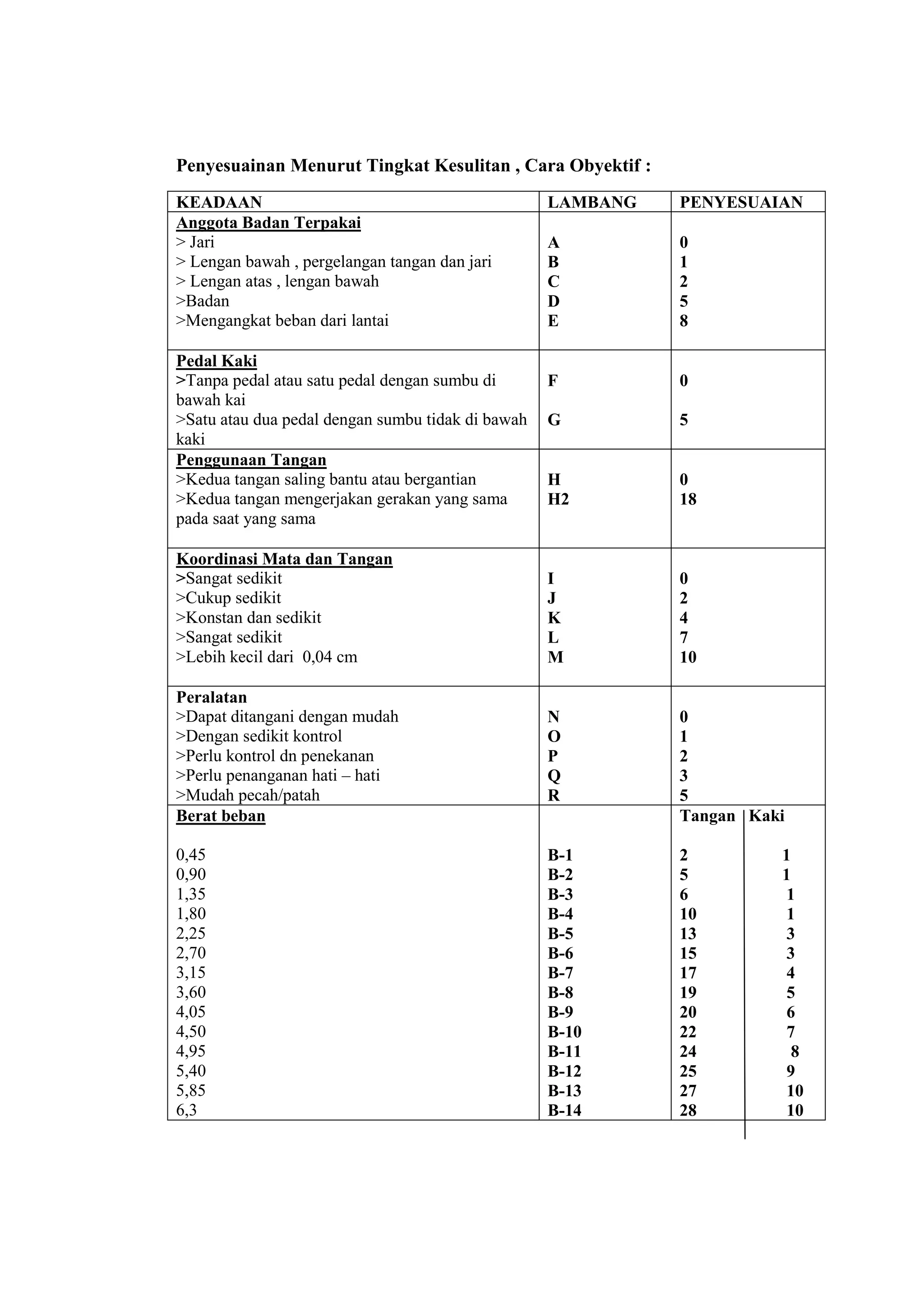 Dokumen ini membahas penyesuaian dalam aktivitas fisik berdasarkan tingkat kesulitan dan penanganan alat. Terdapat klasifikasi mengenai penggunaan tangan, koordinasi mata dan tangan, serta berat beban yang dapat diangkat. Pengkategorian ini mencakup penjelasan tentang cara mengoperasikan peralatan dengan tingkat kontrol yang berbeda-beda.