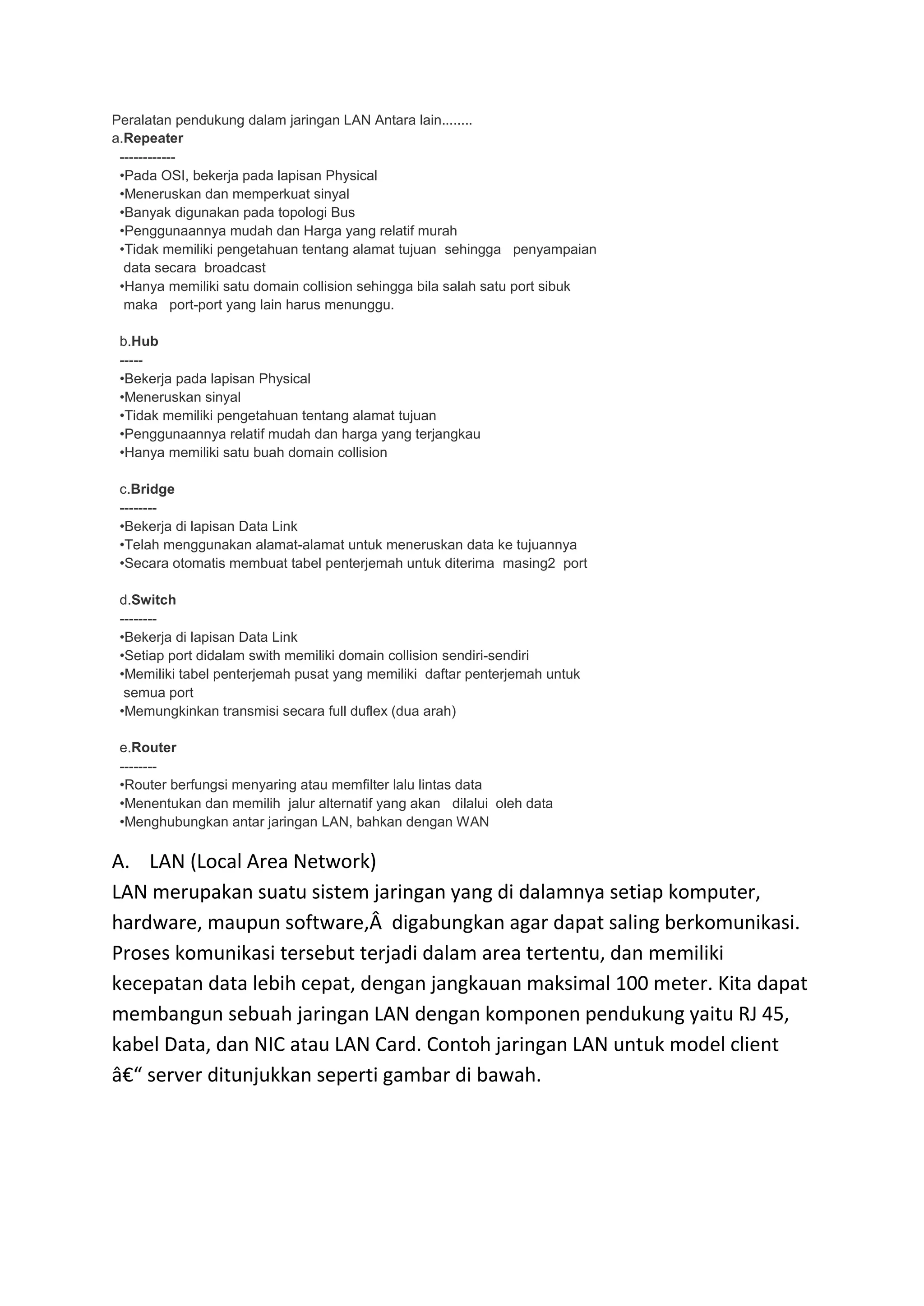 2. Peralatan pendukung LAN antara lain repeater, hub, bridge, switch, dan router yang bekerja pada berbagai lapisan jaringan.