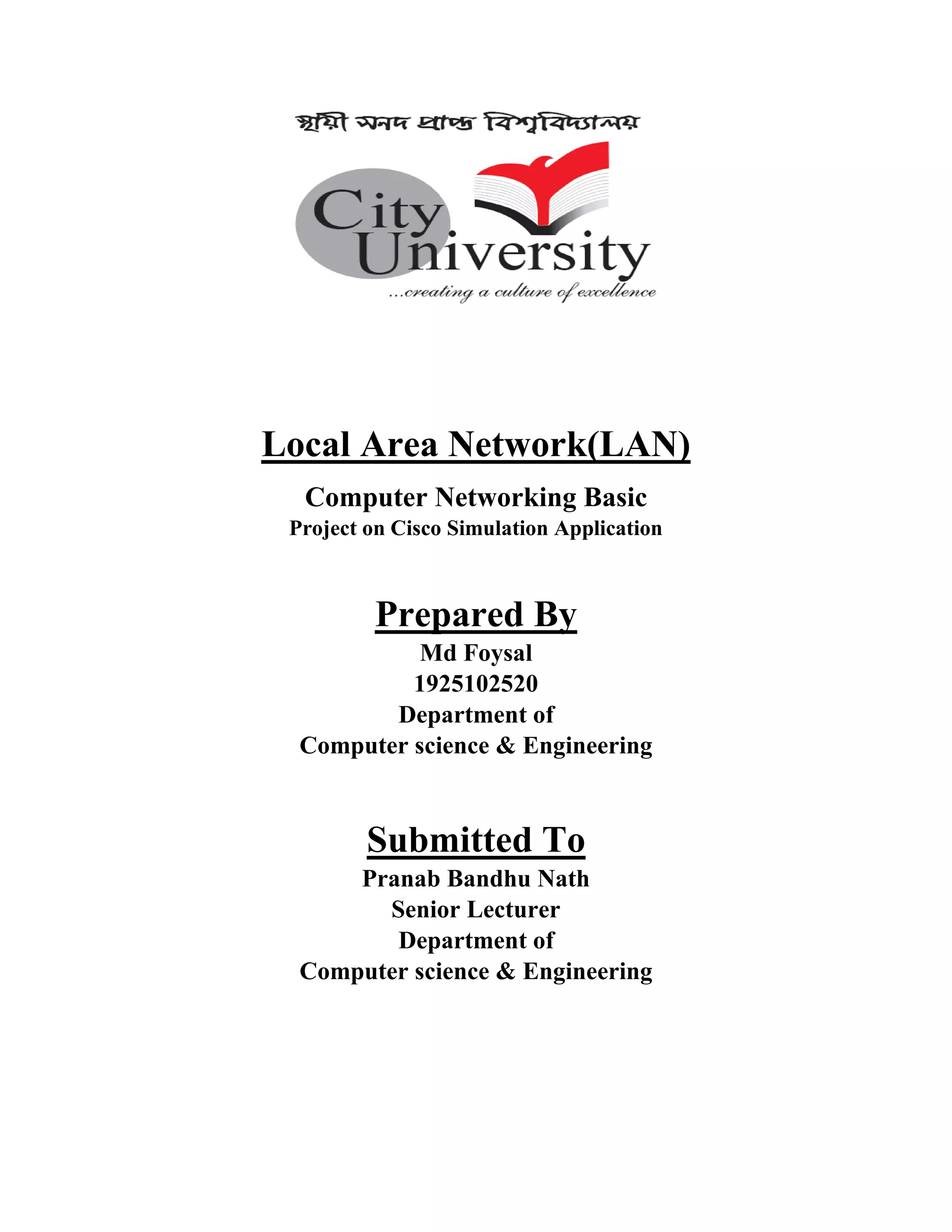 The document discusses a local area network (LAN) project created by Md Foysal for his computer science department. It defines a LAN as a network that allows direct communication between connected devices like PCs. The objectives are to build a secure LAN for an office, school or small business by configuring PCs with unique IP addresses, connecting them to a switch within a single building to enable data transfer.